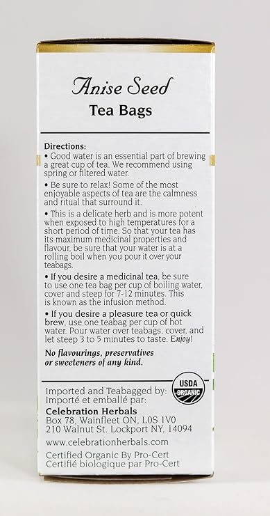 Celebration Herbals Organic Anise Seed Tea is a naturally caffeine-free herbal infusion made from 100% organic Pimpinella anisum (anise seed). Known for its soothing and aromatic flavor, this tea can be enjoyed hot or cold at any time of the day. Packaged in 24 herbal tea bags for freshness and convenience, it is an excellent choice for those seeking a pure, organic, and naturally sweet herbal tea.