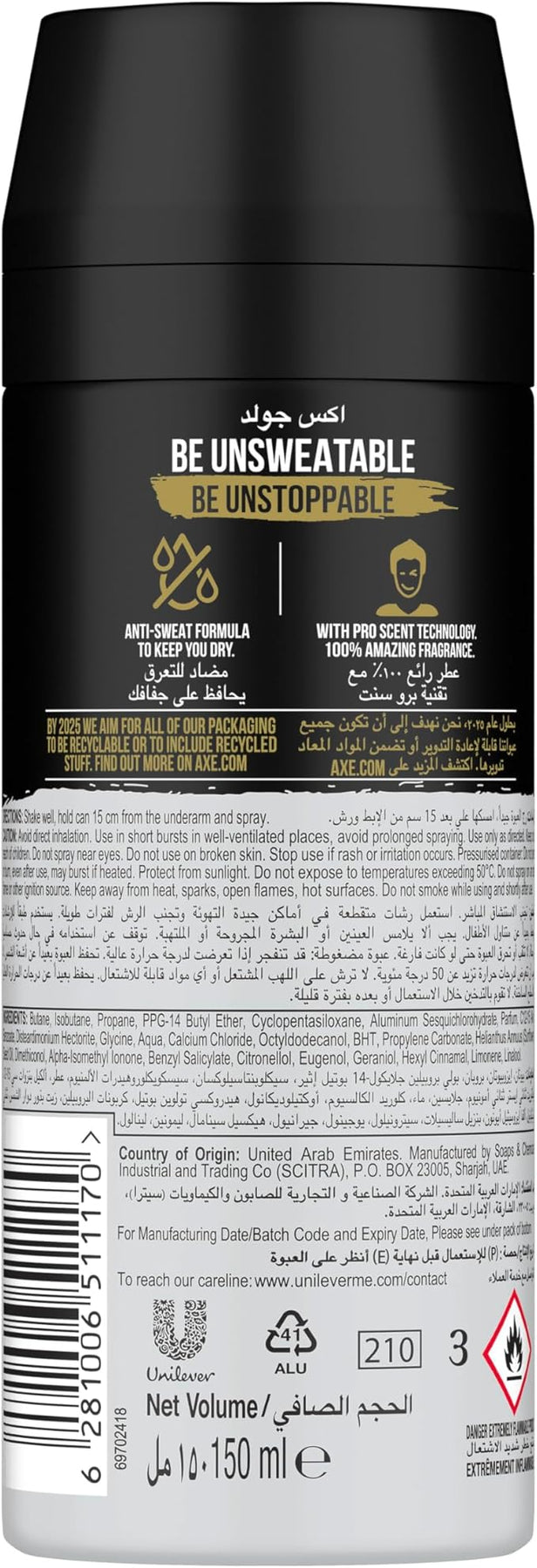 Axe Men Antiperspirant Deodorant Spray Gold provides powerful 72-hour protection against sweat and odour. Designed with Dual Action technology and an odour-busting zinc formula, it keeps you fresh and confident all day. The anti-mark protection helps prevent stains on clothes, while the sleek recyclable can ensures a modern look with sustainability in mind. Simply shake, twist, and spray on underarms for long-lasting freshness.