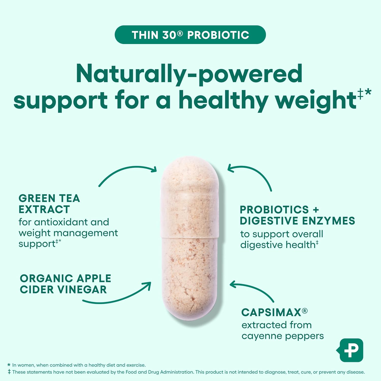 Daily probiotic supplement formulated with 6 probiotic strains, probiotics, digestive enzymes, and plant-based ingredients including green tea and cayenne.