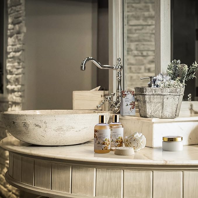 Lovery Luxury Home Spa Gift Basket for Women – Honey & Almond Scent, Bath & Body Set with Shower Gel, Bubble Bath, Lotion, Bath Salts, Bath Bomb & Bath Puff, Paraben-Free, Cruelty-Free